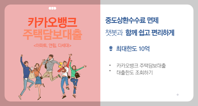 주택담보대출 카카오뱅크는 기존은행은 방문해서 대기하고 상담하는 방식으로 진행하였다면 카뱅 주담대는 3분 정도면 대출가능여부와 대출한도와 금리까지 조회가 가능하고 시중은행보다 낮은 금리에 중도상환수수료까지 면제입니다