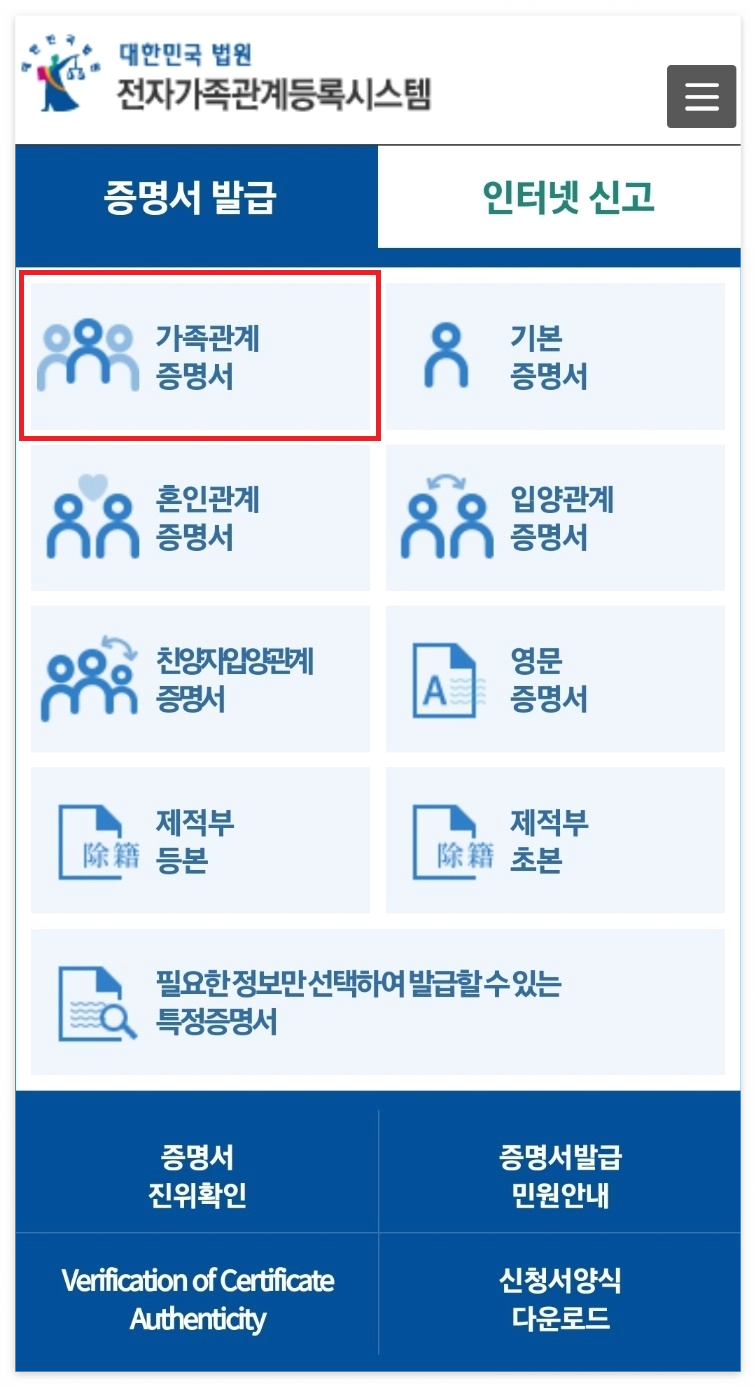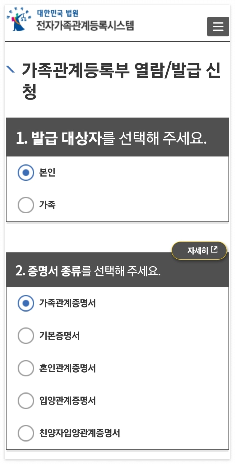 약관에 동의한 후 인적사항을 입력하고 인증한 후 가족관계등록 부 열람 및 발급신청서를 입력해 줍니다